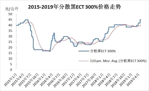 進(jìn)入2019年,國(guó)內(nèi)分散染料市場(chǎng)在經(jīng)歷小幅度回調(diào)后,再度開始上漲模式,截至2019年4月底,分散染料市場(chǎng)價(jià)格再度站上45元/公斤一線(分散黑ECT 300%),于此同時(shí),分散染料市場(chǎng)也徹底收復(fù)了2015年暴跌以來(lái)所有跌幅。
