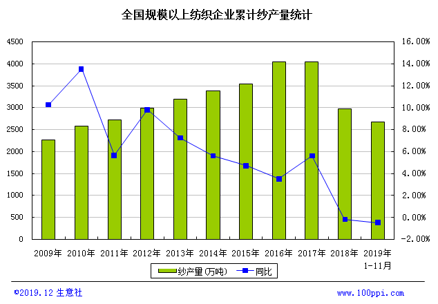 國家統計局數據:2019年11月我國紗產量為261.4萬噸,同比減少2.1%。1-11月紗產量為2678.9萬噸,累計減少0.5%。 14%