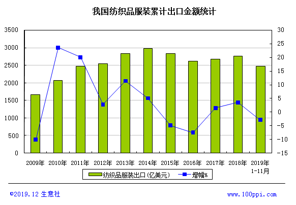 據中國海關總署最新統計數據顯示,2019年1-11月我國紡織品服裝累計出口2468.8億美元,同比下降2.7%,其中紡織品出口1092.6億美元,同比微增0.1%,服裝出口1376.2億美元,同比下降4.7%。 12016.0億元