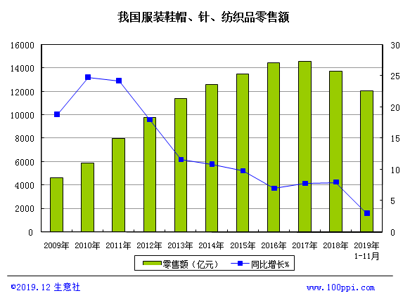 據中國海關總署最新統計數據顯示,2019年1-11月,我國服裝鞋帽、針、紡織品類商品零售類累計值為12016.0億元,同比累計增長3%。 162.23萬噸