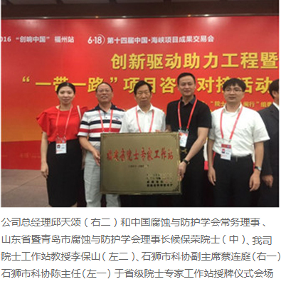 6月18日,在由“院士專家八閩行”組委會主辦的第十四屆“6·18”創新驅動助力工程暨院士專家項目簽約授牌暨“一帶一路”項目咨詢對接活動啟動儀式專場活動上,我司石獅華寶新材料工程有限公司獲“省級院士專家工作站”授牌。 該會上為10家新建院士專家工作站、10個院士專家示范工作站授牌,我司院士專家工作站在列,也是石獅市第三家省級院士專家工作站。中國工程院胡壯麒院士及其專家團隊進駐我司院士工作站,對接項目是“高性能重防腐新型材料的研究與開發”,此次對接將院士及其專家團隊在專業領域的前沿科技成果,與石獅市新材料產業對接,以科技創新突破產業發展瓶頸,以高端智力引領產業轉型升級,為石獅實業強市做出新的貢獻。省科協、泉州市政府、石獅市政府、科協等各官方網站及各電視臺、報紙均對此做出各類報道。 ![]()